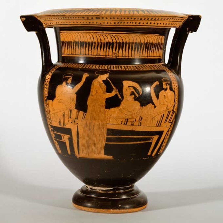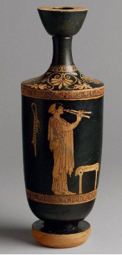 Next day, the man appeared in the market place accompanied by a beautiful lady. They asked Arsinoe, if she wanted to come and stay with them and become a musician. She only had to sing and play the flute to the guests at the banquets. She would earn more money than selling pots and pans in the market place. Arsinoe considered their offer for a while and then accepted it.